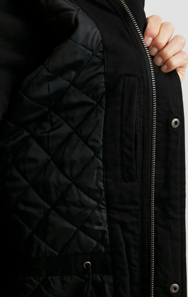 - DETAILS & HIGHLIGHTS: Baumwoll Parka, hochabschließende Kapuze mit runden Baumwoll-Kordeln, Verschluss mit Reißverschluss und Druckknopf-Leiste, zwei Pattentaschen mit Druckknöpfen, Metall Patch am unteren Saum, verstellbare Ärmelsäume, innenliegender Tunnelzug mit Kordeln, gestepptes Lining, Schlitz auf der Rückseite am Saum, eine Innentasche, angenehm weiche Baumwoll-Qualität