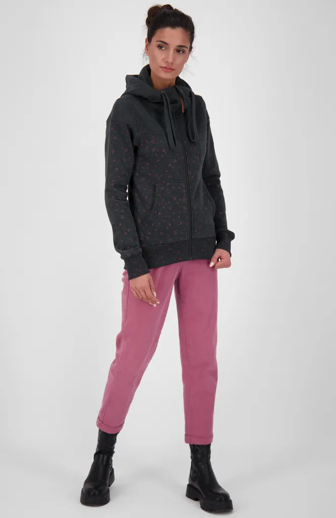 Unser Klassiker-update der in keinem gut sortierten Kleiderschrank fehlen darf – die gemusterte Kapuzensweatjacke PalinaAK B von Alife and Kickin. Sportiv und einfach lässig kommt sie daher und bringt frischen Wind ins driste Alltagsgrau. Die lebendige Persönlichkeit erhält die farblich zweigeteilte Sweatjacke durch die unifarbene Schulterpartie in Kombination mit dem unteren Bereich, der in verspieltem alloverprint gehalten ist. Eine große Kapuze mit Innennfutter übergehend in den hohen Kragenbereich mit integriertem Zipp-Kinnschutz und die farblich abgestimmte Kordel machen das entspannte Lieblingsteil zum trendigen Alleskönner. Die geteilte Kängurutasche in Front, die Platz für Kleinigkeiten bietet, und die formstabilen Bündchenabschlüsse an Ärmeln und Saum haben schon so manche Frau von dieser Kapuzenjacke überzeugt. Denn Dank der leicht taillierten Passform und den liebevoll verarbeiteten Labeldetails hat PalinaAK B trotz ihres sportiven Erscheinungsbildes eine feminine Wirkung. Toll das es dich gibt – die erfrischend andere Damenjacke PalinaAK B von Alife and Kickin.