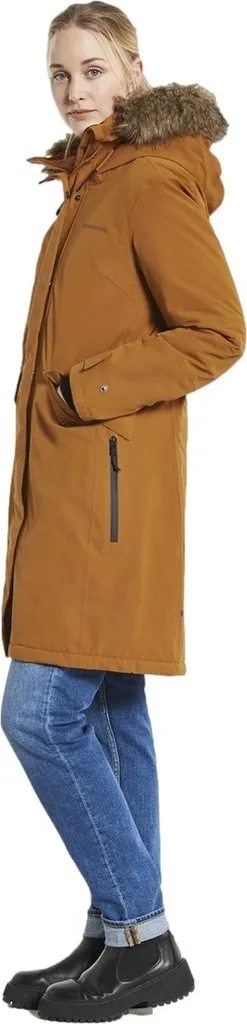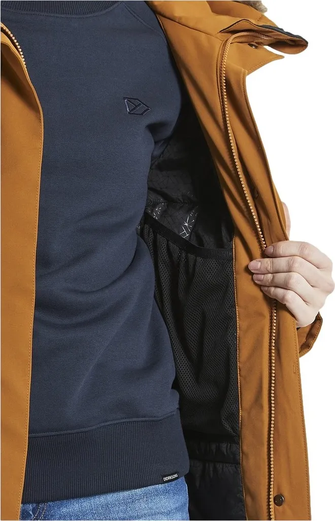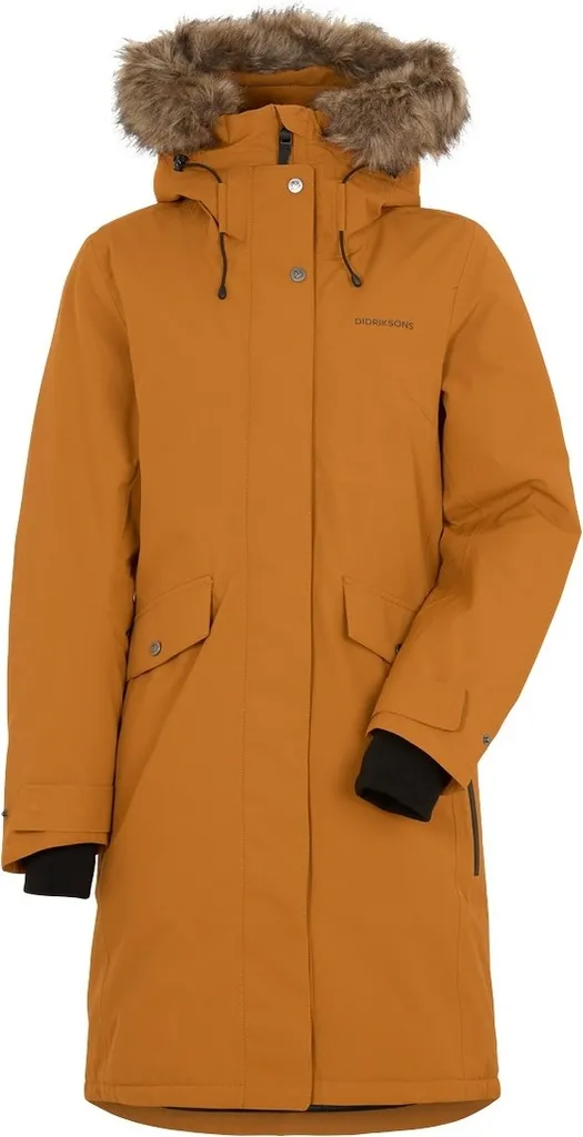 Weiche Polyesterqualität mit mattem Finish. Hoher Kragen und verstellbare Kapuze mit abnehmbarem Besatz aus Fellimitat. 2-Wege-Reißverschluss mit Windschutzleiste, zwei Vordertaschen mit Druckknopfverschluss und zwei Taschen mit wasserdichtem Reißverschluss. Zwei Innentaschen, eine davon mit Reißverschluss. Saum, Taille, Ärmelabschlüsse und Kapuze sind verstellbar. Gerippte Innenbündchen mit Daumenloch. Der Didriksons-Name und das -Logo, das Band in der Vordertasche sowie die Reißverschlussschieber sind reflektierend. Isolierung aus 100 % Recyclingfasern und pigmentgefärbtes Futter. Bei der Pigmentfärbung von Polyester- oder Polyamidstoffen werden bis zu 80 % weniger Wasser verbraucht als bei herkömmlichen Färbeverfahren. Bei den Farbstellungen Black, Dark Night Blue und Deep Green ist auch der Oberstoff pigmentgefärbt. PFC-freie wasserabweisende Imprägnierung.