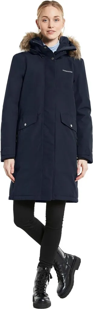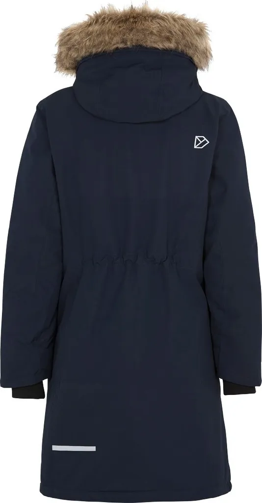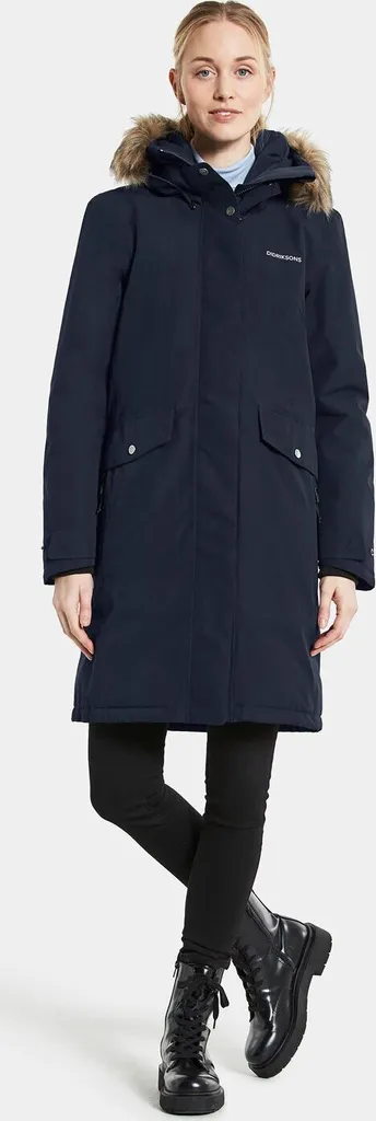 Weiche Polyesterqualität mit mattem Finish. Hoher Kragen und verstellbare Kapuze mit abnehmbarem Besatz aus Fellimitat. 2-Wege-Reißverschluss mit Windschutzleiste, zwei Vordertaschen mit Druckknopfverschluss und zwei Taschen mit wasserdichtem Reißverschluss. Zwei Innentaschen, eine davon mit Reißverschluss. Saum, Taille, Ärmelabschlüsse und Kapuze sind verstellbar. Gerippte Innenbündchen mit Daumenloch. Der Didriksons-Name und das -Logo, das Band in der Vordertasche sowie die Reißverschlussschieber sind reflektierend. Isolierung aus 100 % Recyclingfasern und pigmentgefärbtes Futter. Bei der Pigmentfärbung von Polyester- oder Polyamidstoffen werden bis zu 80 % weniger Wasser verbraucht als bei herkömmlichen Färbeverfahren. Bei den Farbstellungen Black, Dark Night Blue und Deep Green ist auch der Oberstoff pigmentgefärbt. PFC-freie wasserabweisende Imprägnierung.