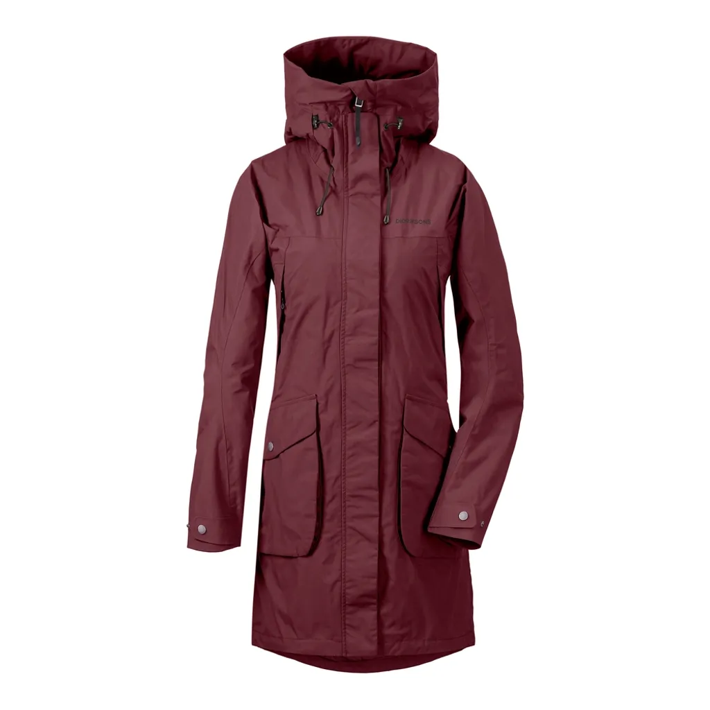 Der Parka Thelma im klassischen Didriksons-Design ist dank versiegelter Nähte zu 100 % wasser- und winddicht. Aus strapazierfähigem Polyamid mit mattem Finish gearbeitet. Die feminine Passform lässt sich durch den Kordelzug in der Taille und am Saum noch unterstreichen. Mit Druckknopf verstellbare Ärmelabschlüsse. Die angeschnittene Kapuze ist in zwei Richtungen verstellbar. Gute Belüftung dank 2-Wege-Reißverschluss mit Windschutzleiste und verdeckter Knöpfung vorn. Zwei Vordertaschen mit Knopfverschluss und zwei Brusttaschen mit Reißverschluss. Zwei Innentaschen, eine davon mit Reißverschluss. Spinngefärbtes Futter. Die Spinnfärbung spart Wasser, Energie und Chemikalien in der Produktion. PFC-freie Imprägnierung.