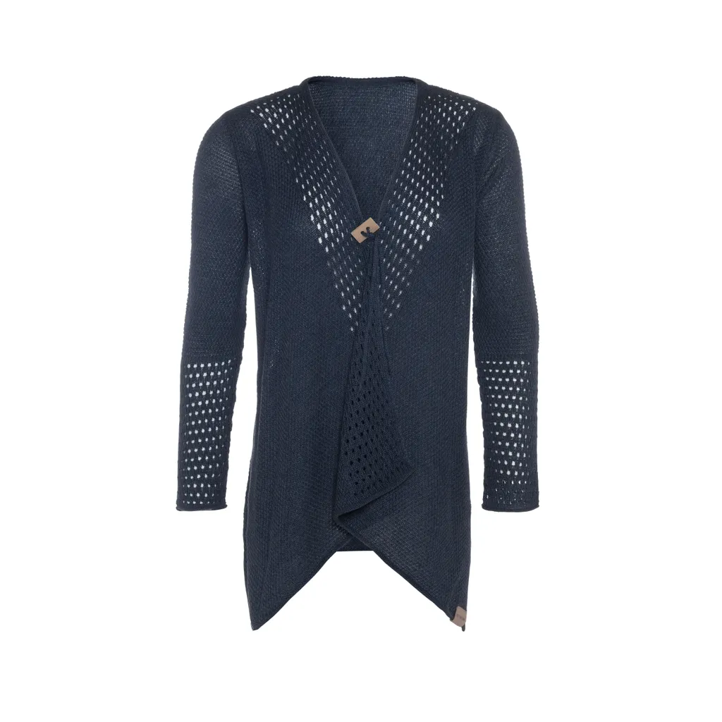 Unsere leichte Strickjacke April in der Farbe Denim ist ein kurzer Damen-Cardigan für Frühling und Sommer in der Größe 40/42. Das gestrickte Material besteht aus 50 % Baumwolle und 50 % Polyacryl. Das macht diese Sommer-Strickjacke besonders weich, luftig und geschmeidig. Wir haben dieses Modell mit Liebe zum Detail entworfen. An den Enden der Ärmel und Kanten an der Vorderseite läuft das glatt gestrickte Strickmuster in ein raffiniertes Lochmuster über, das für eine verspielte Optik sorgt. Seitlich läuft diese dunkelblaue Strickjacke spitz aus bis über die Hüfte und hat links an dieser Stelle unser label. Durch diesen lockeren Schnitt bildet die vordere Kante schöne Falten. Man kann die Strickjacke April in der Farbe Dunkelblau sowohl offen tragen, als auch an einer Stelle mit einem Bändchen und eckigem Knopf zubinden.