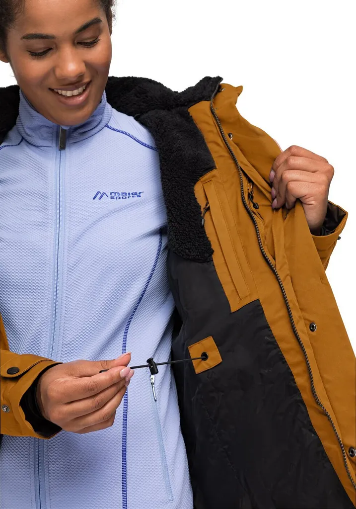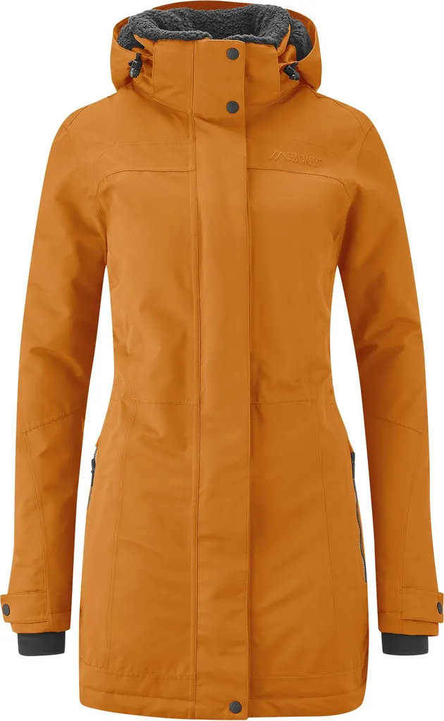 Funktioneller Outdoor-Mantel mit abnehmbarer Kapuze. Der Mantel besitzt Passeneinsätze im Front- und Rückenteil sowie Pattentaschen mit Reißverschluss. Die verstellbare Taille mit Kordel sowie die elastischen Ärmelbündchen tragen zur guten Passform des Mantels bei. Das Teddyfutter in der Kapuze, im Kragen und im oberem Futterteil machen den Mantel zu einem optischen Highlight.