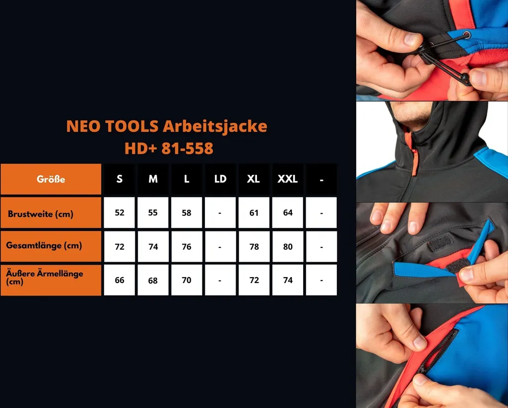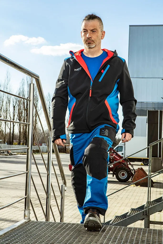 Die NEO Softshell-Jacke ist wasserdicht, winddicht und atmungsaktiv, wodurch sie bei jederlei Wetter einsatzfähig ist. Die Jacke ist leicht und bequem und dank des inneren Polarfleece gleichzeitig warm. Das Produkt hat 3 Taschen unter der Falte versteckt, darunter 2 Reißverschlusstaschen. Diese Taschen sind im Hüft-, als auch Brustbereich zu finden. Farblich ist die Jacke in schwarz gehalten, mit farbigen Akzenten, wie blau und rot. Dank des Schnittes ist die Jacke auch in arbeitsfremden Situationen tragbar und kann für jegliche Freizeit-, als auch Sportaktivitäten verwendet werden. Die Marke NEO erfüllt die Erwartungen von Profis.