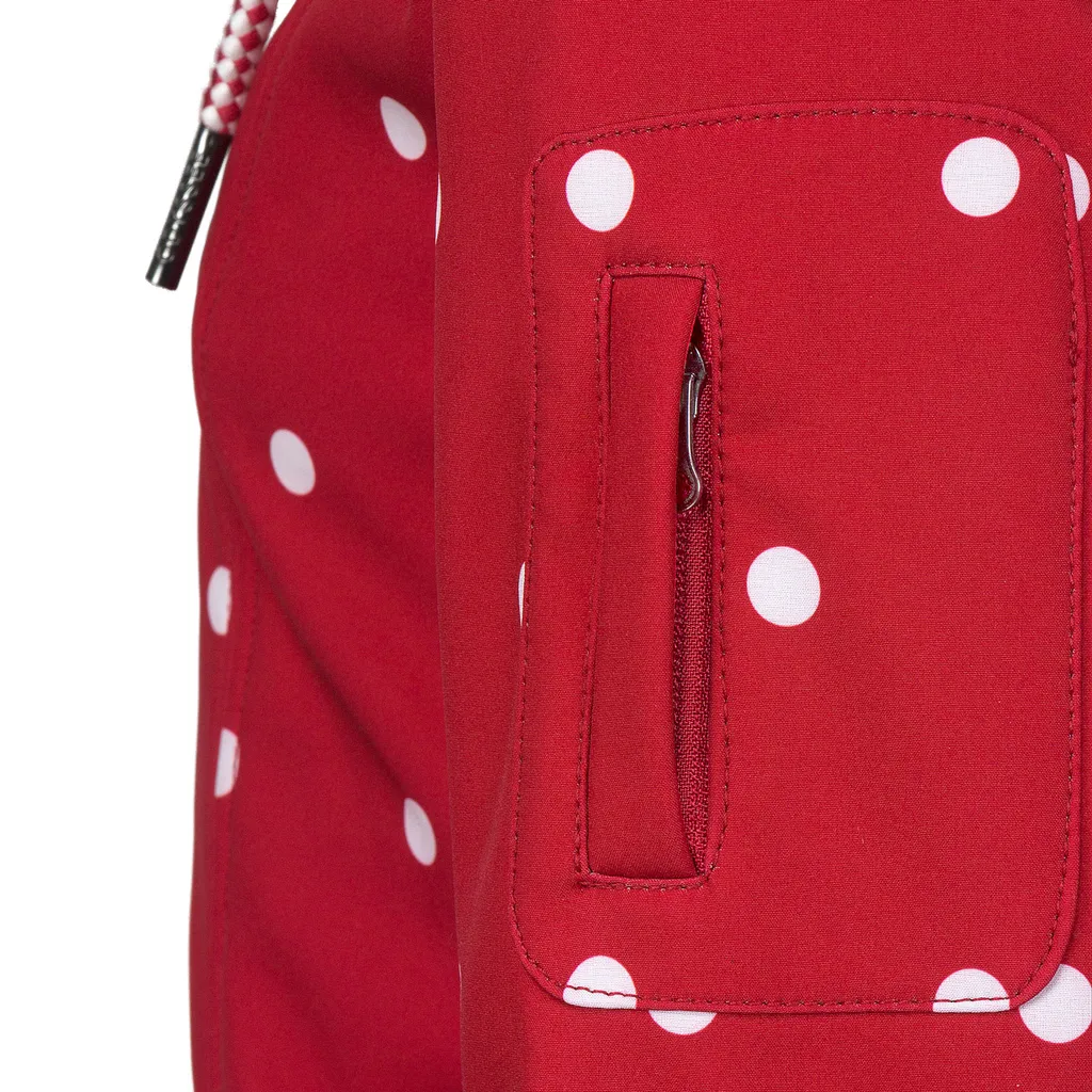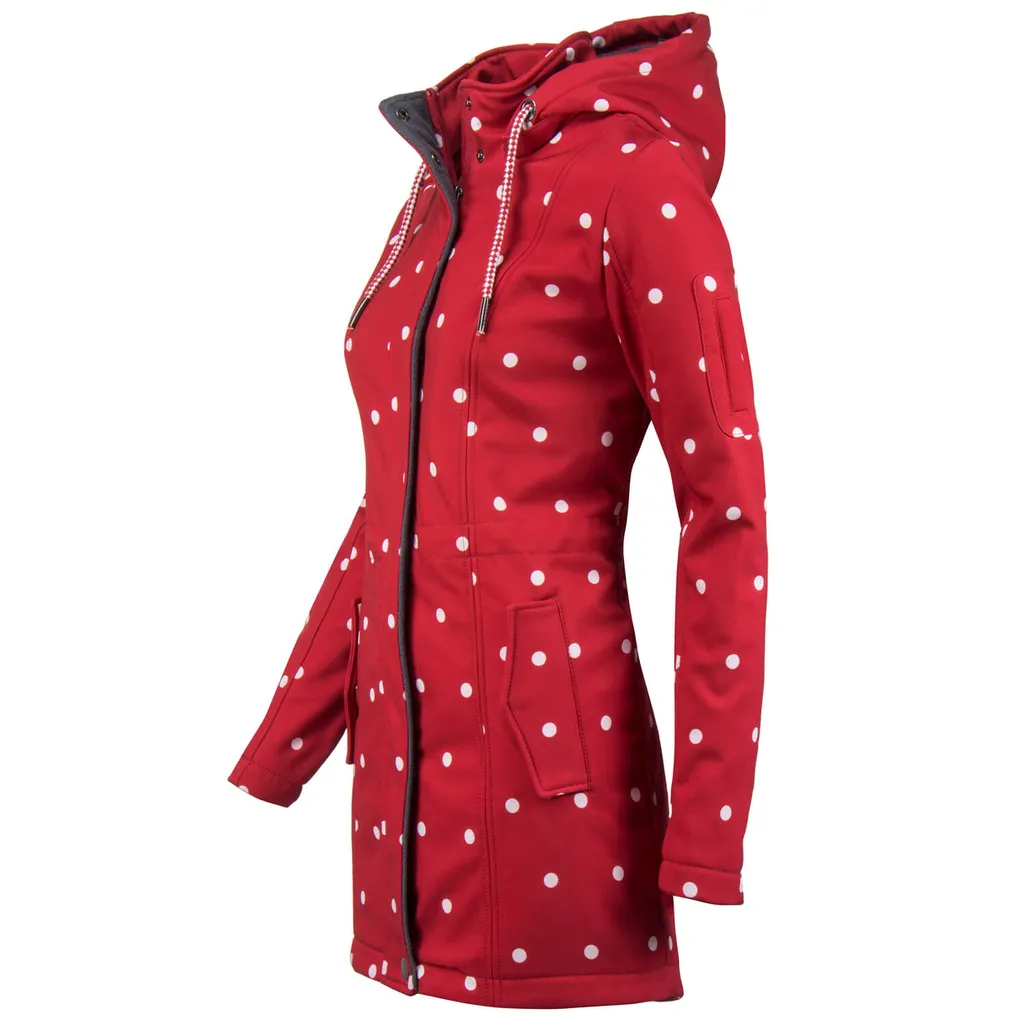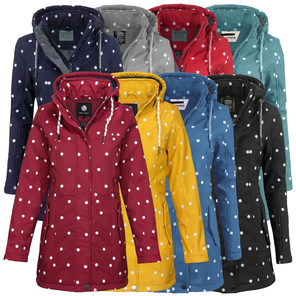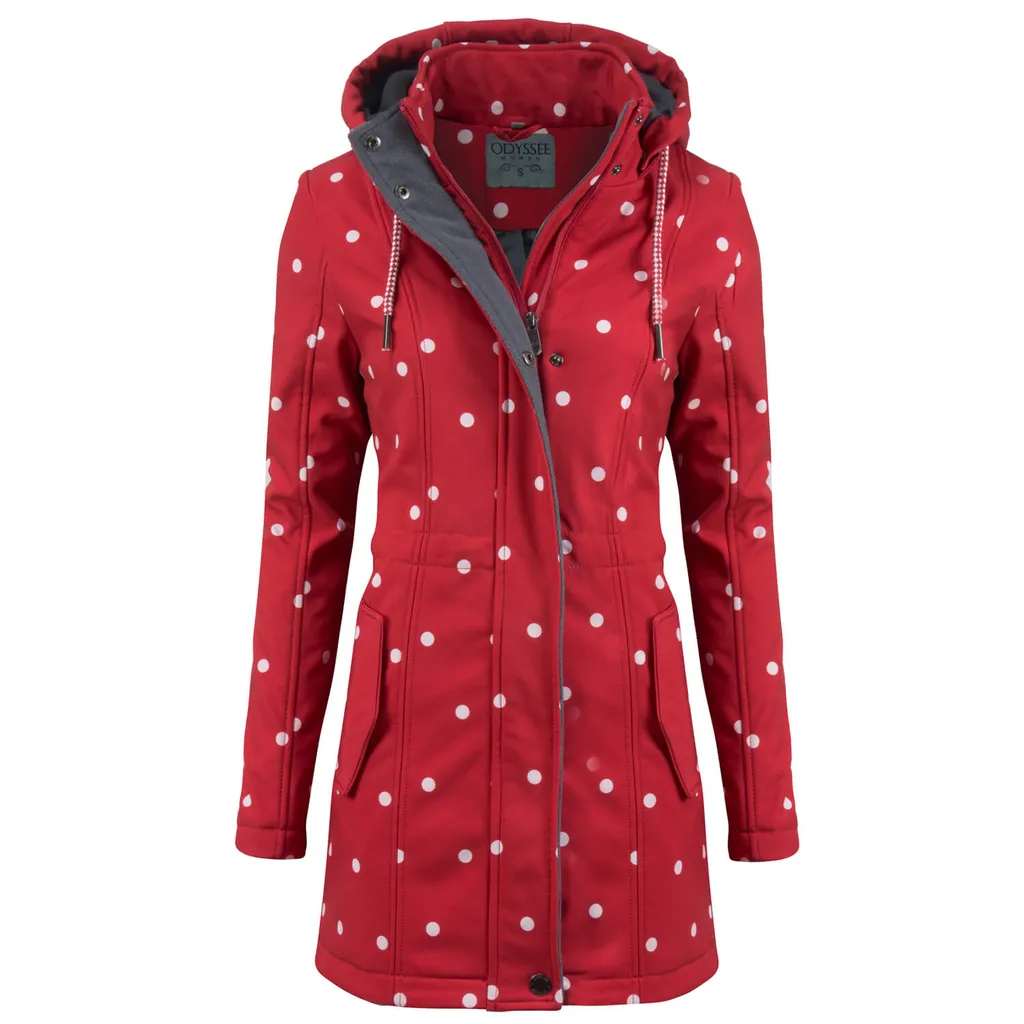 Der Softshellmantel von ODYSSEE präsentiert sich im femininen A-Linien Schnitt und begeistert durch viele funktionale Details. Der Mantel ist mit zwei verschließbaren Eingriffstaschen, einer Innentasche und einer kleinen Ärmeltasche ausgestattet. Zu schließen ist der Mantel mit einem Reißverschluss mit Druckknopfblende. Die Weite der Taille und der gefütterten Kapuze ist durch einen Tunnelzug individuell regulierbar. Die Ärmelweite kann ebenfalls durch zwei Druckknöpfe angepasst werden. Durch den tollen allover Punkte-Print und den modischen Schnitt liegt der Softshellmantel absolut im Trend und setzt jedem Outfit die Krone auf.