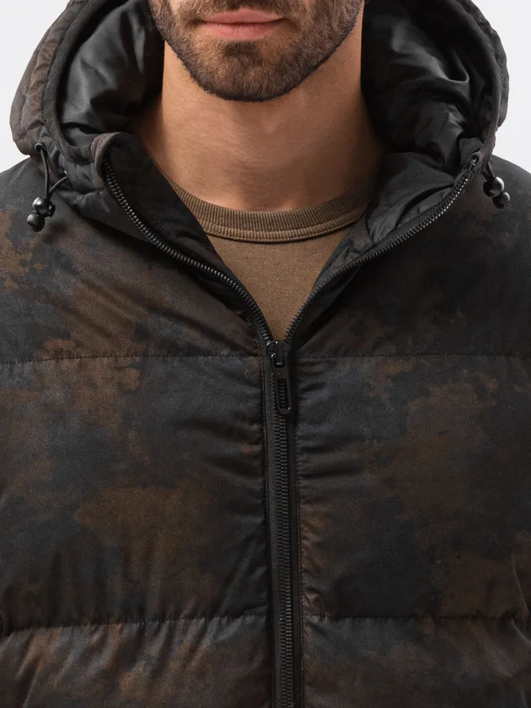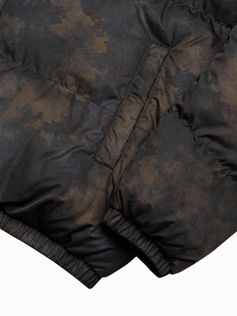 Herren-Steppjacke mit Kapuze im flauschigen Stil. Gemustertes Material, das an Camouflage erinnert. Die Ärmel sind mit einem elastischen Gummizug versehen, der das Ausblasen verhindert. Erhöhter Kragen am Hals. Material: 100% Polyester, 100% Polyester (Beschichtung)