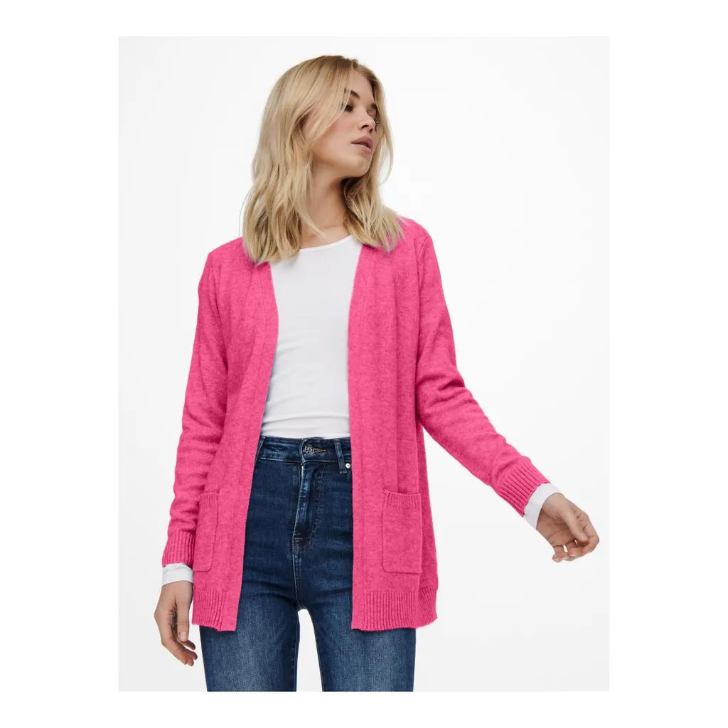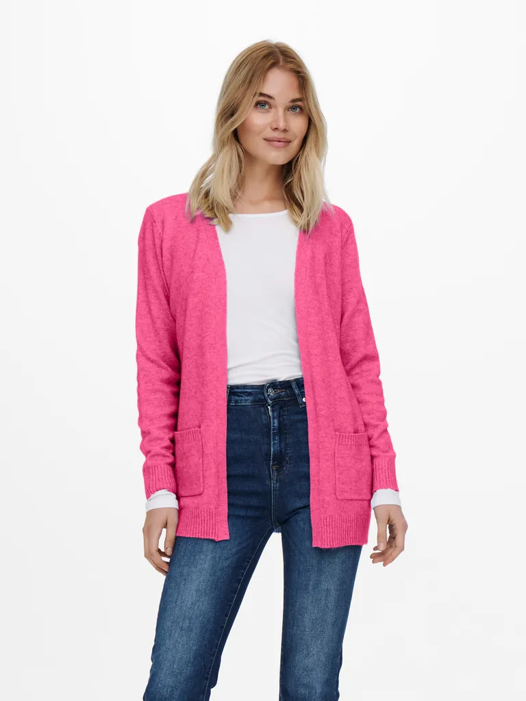 Lange Strickjacke, Einfarbig, Vorn offen, 2 offene Taschen vorn, Rippbündchen- Länge: 75 cm in Größe M- Das Model trägt Größe S.