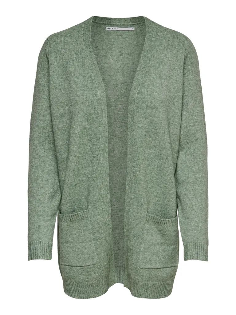 Lange Strickjacke, Einfarbig, Vorn offen, 2 offene Taschen vorn, Rippbündchen- Länge: 75 cm in Größe M- Das Model trägt Größe S.