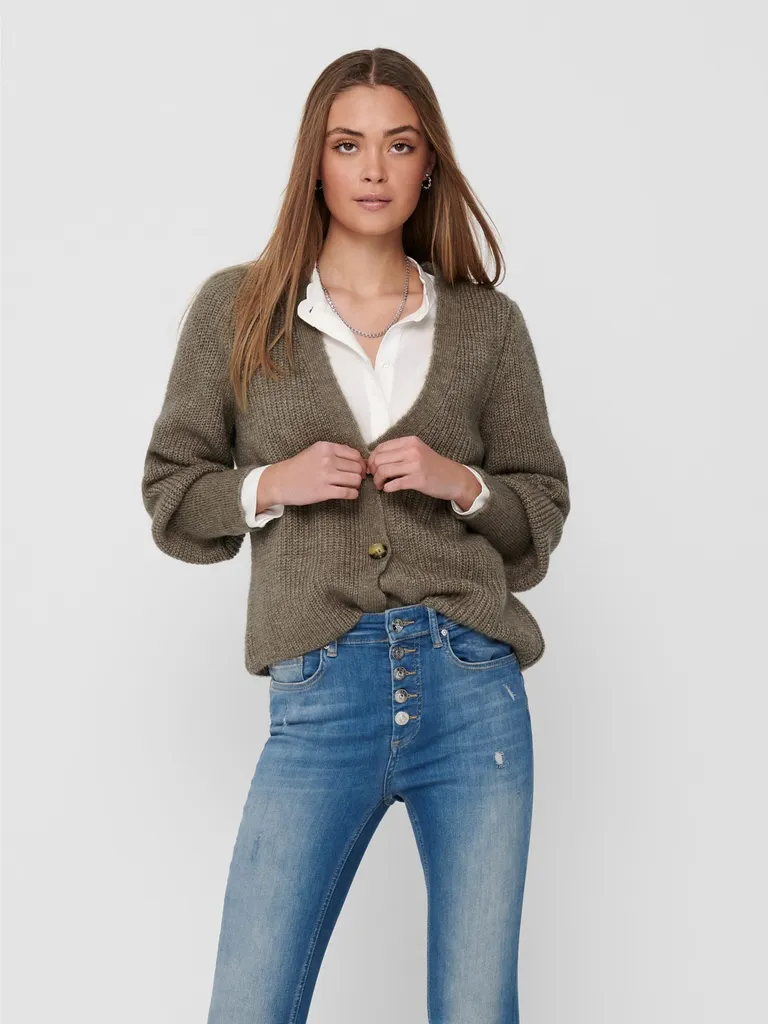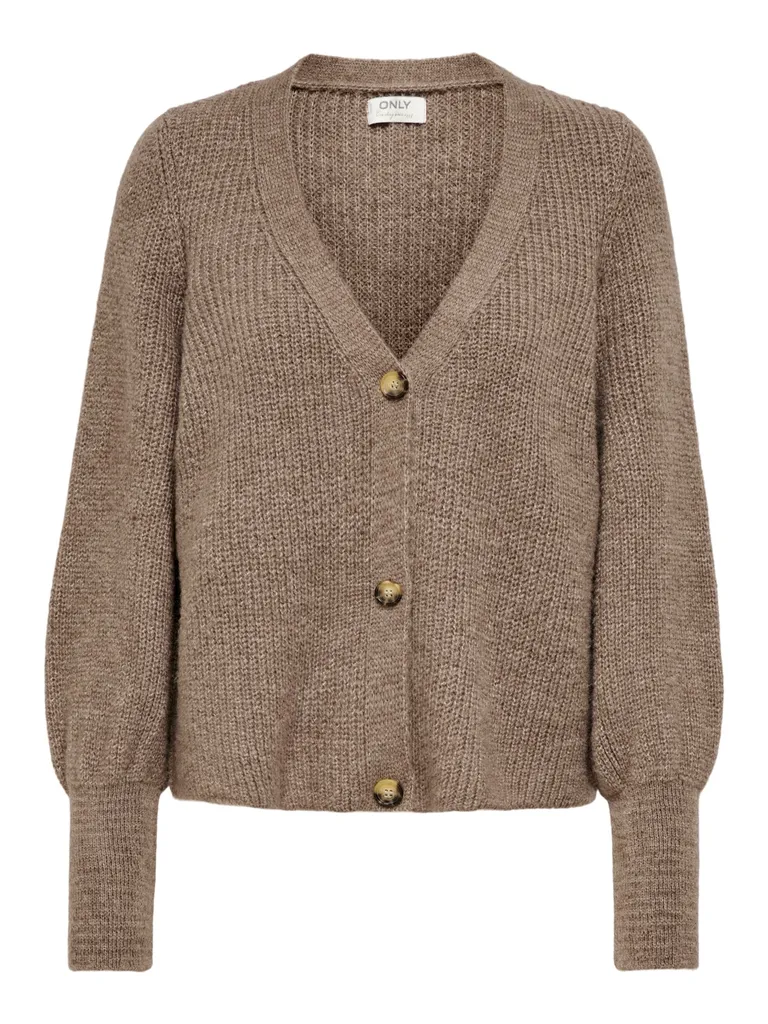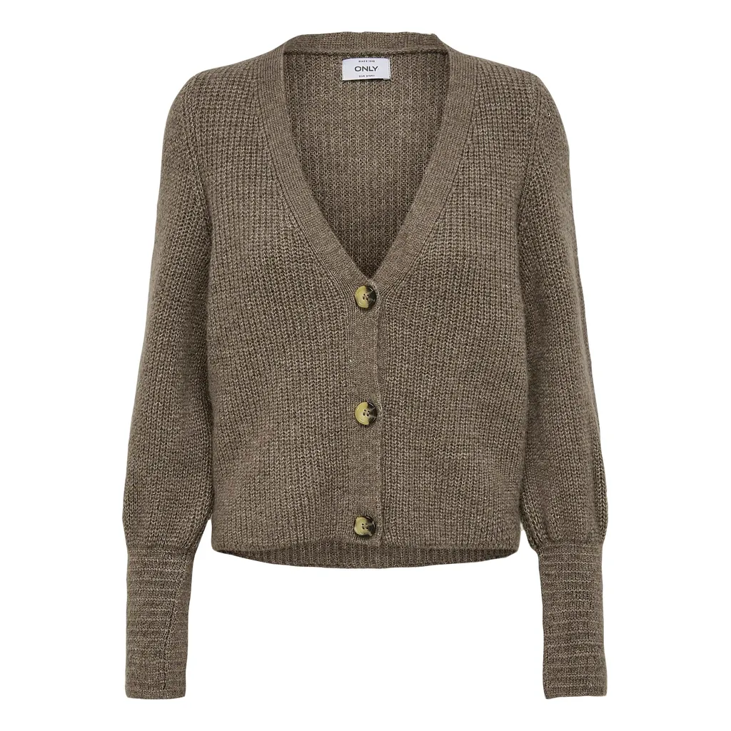 Einfarbige Strickjacke von ONLY® mit V-Ausschnitt, Knopfleiste und Rippbündchen. An den Ärmelenden schmal geschnitten. Länge: 56 cm in Größe M. Das Model trägt Größe S.