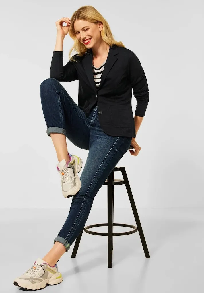 Ready for Fashion! Klassischer Damenblazer von Street One in Unifarbe. Hier trifft Basic auf einen femininen Fit. Der Reverskragen und der Zwei-Knopf-Verschluss geben dem Blazer eine lässige Note. Die Taschen ergänzen den Look. Blazer Basic Unifarbe Reverskragen Maße bei EU-Größe 38 ca.: Länge 62 cm, Brust 97 cm, Saumweite 105 cm Material: 95% Baumwolle, 5% Elasthan