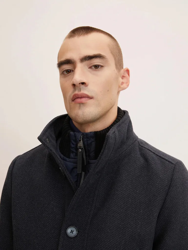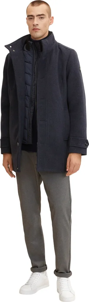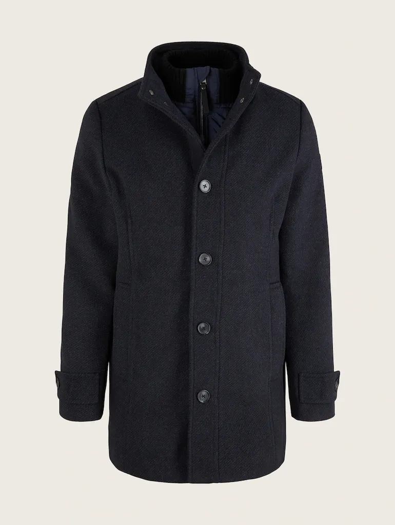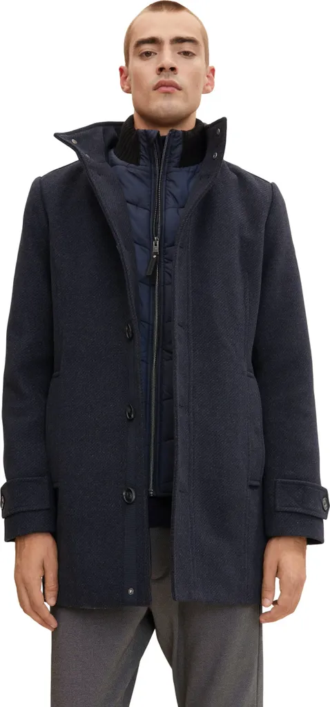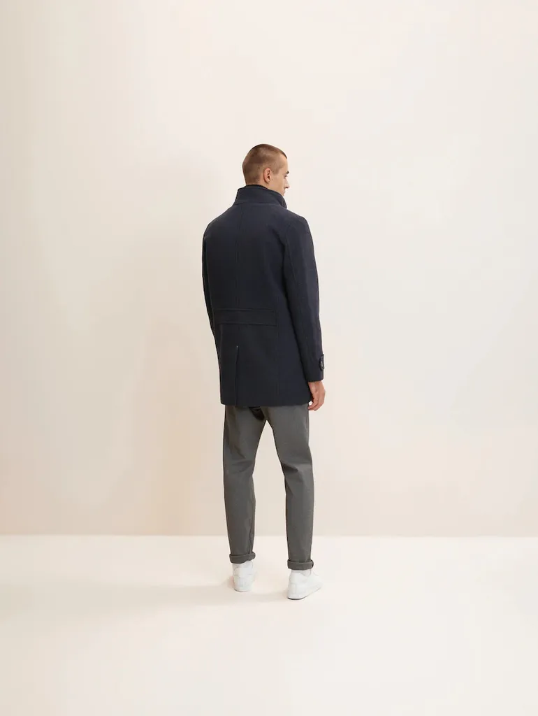 Langärmliger Wollmantel von Tom Tailor® mit Stehkragen, Reißverschluss und Knopfleiste aus pflegeleichten Fasern und weichem Wollanteil.