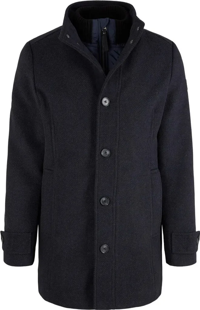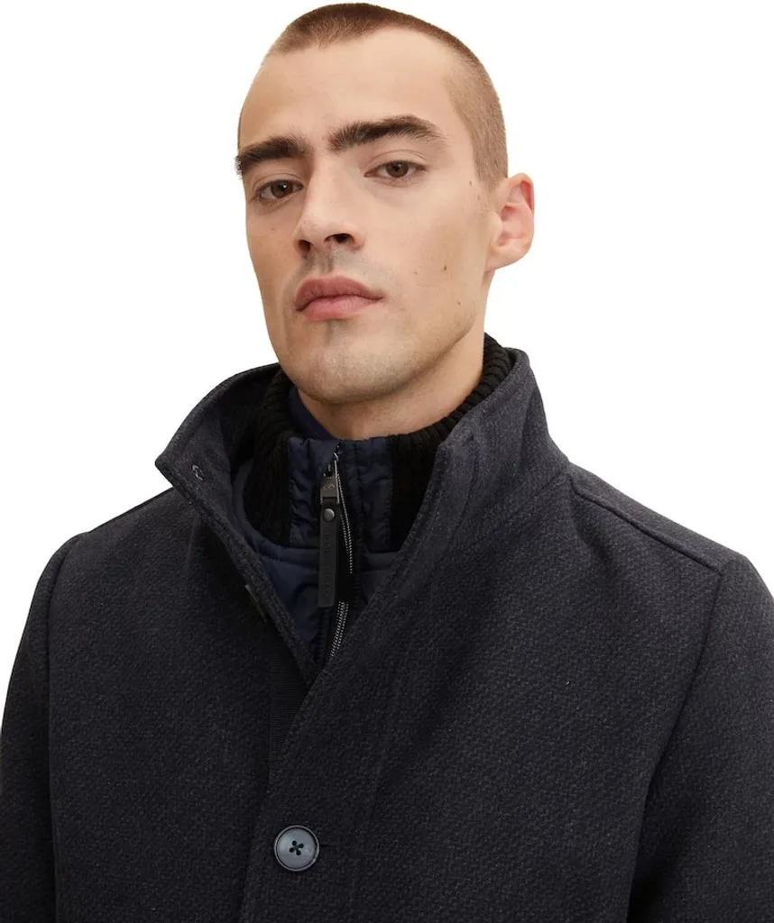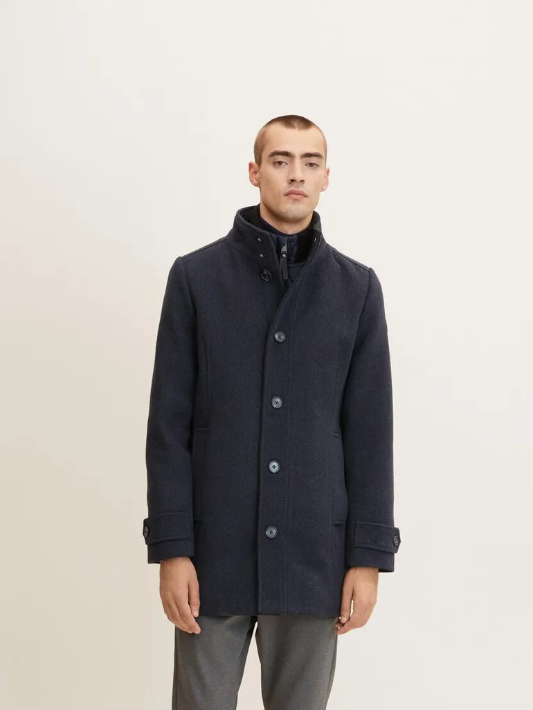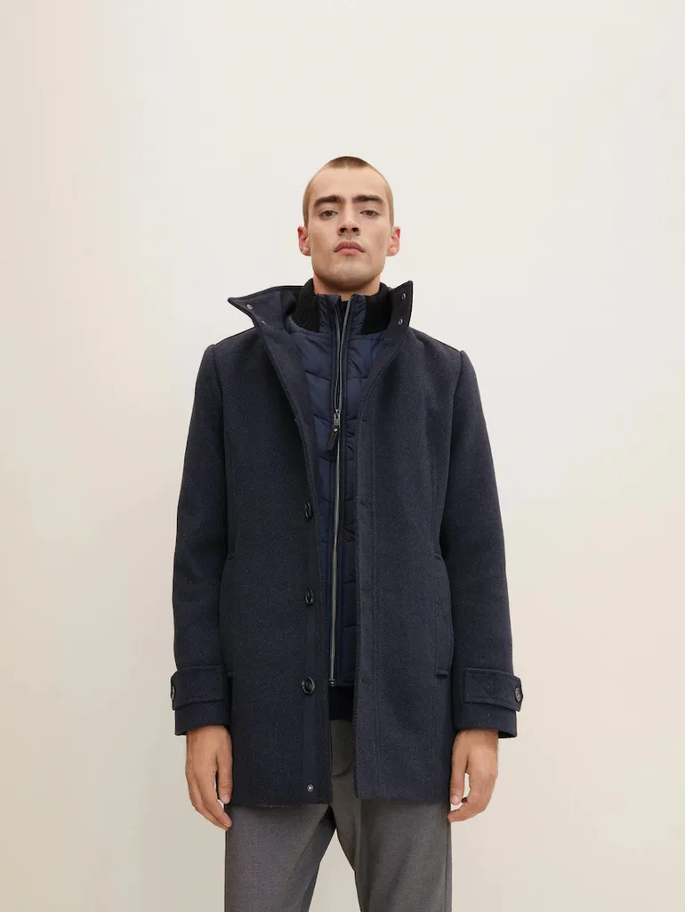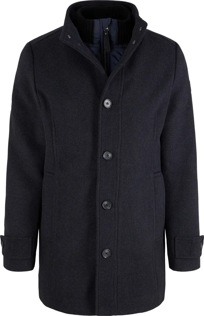 Langärmliger Wollmantel von Tom Tailor® mit Stehkragen, Reißverschluss und Knopfleiste aus pflegeleichten Fasern und weichem Wollanteil.