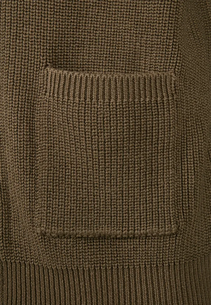 Seitlich aufgesetzte Taschen sowie bequeme Rib-Strickbündchen an Ärmel und Saum.